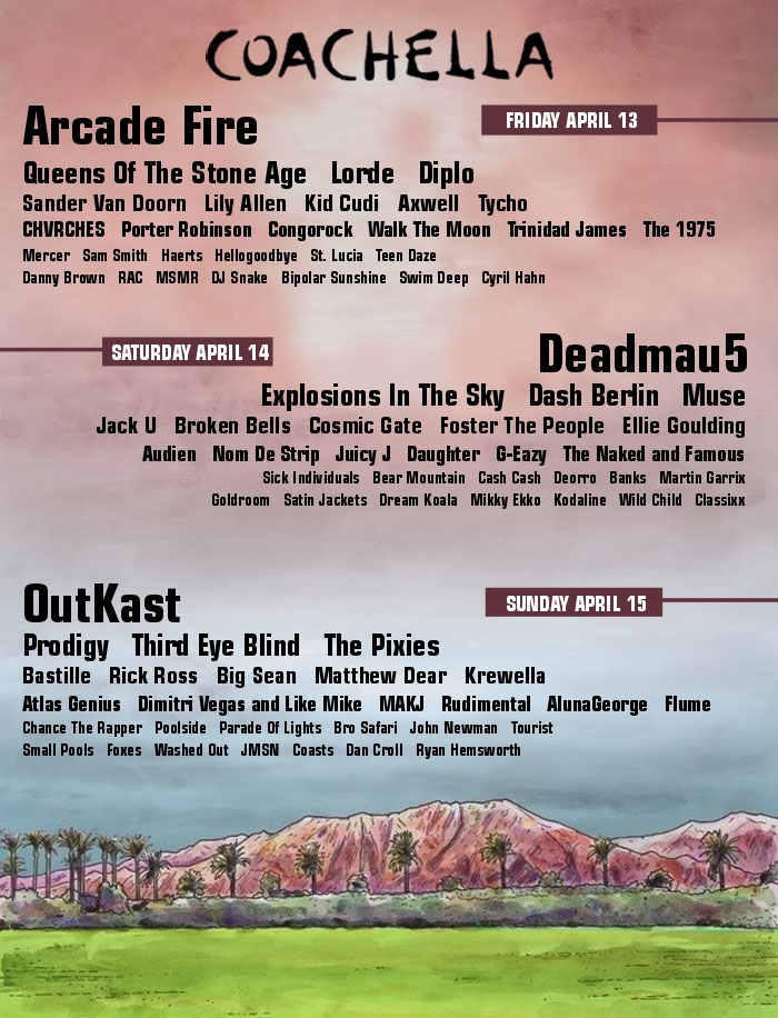 I had to put the obvious headliner choices like OutKast and Arcade Fire, but I would REALLY love to see Deadmau5 headline Coachella. If Swedish House Mafia can do it, so can the Mau5. I also had to include bands like The Pixies and Queens Of The Stone Age because it seems highly likely one of them (if not both) will be at Coachella this year. After that, I just let it rip filling up the slots.* Take a look below and let me know what you think of my predictions!